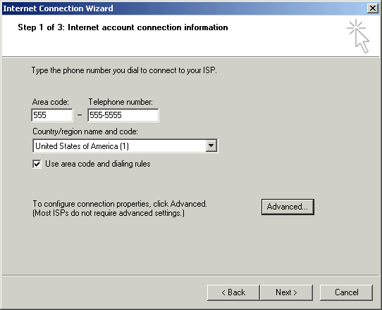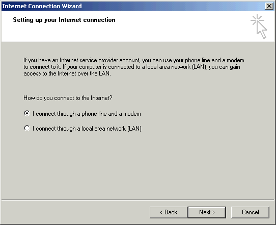 - Select I connect through a phone line and a modem.